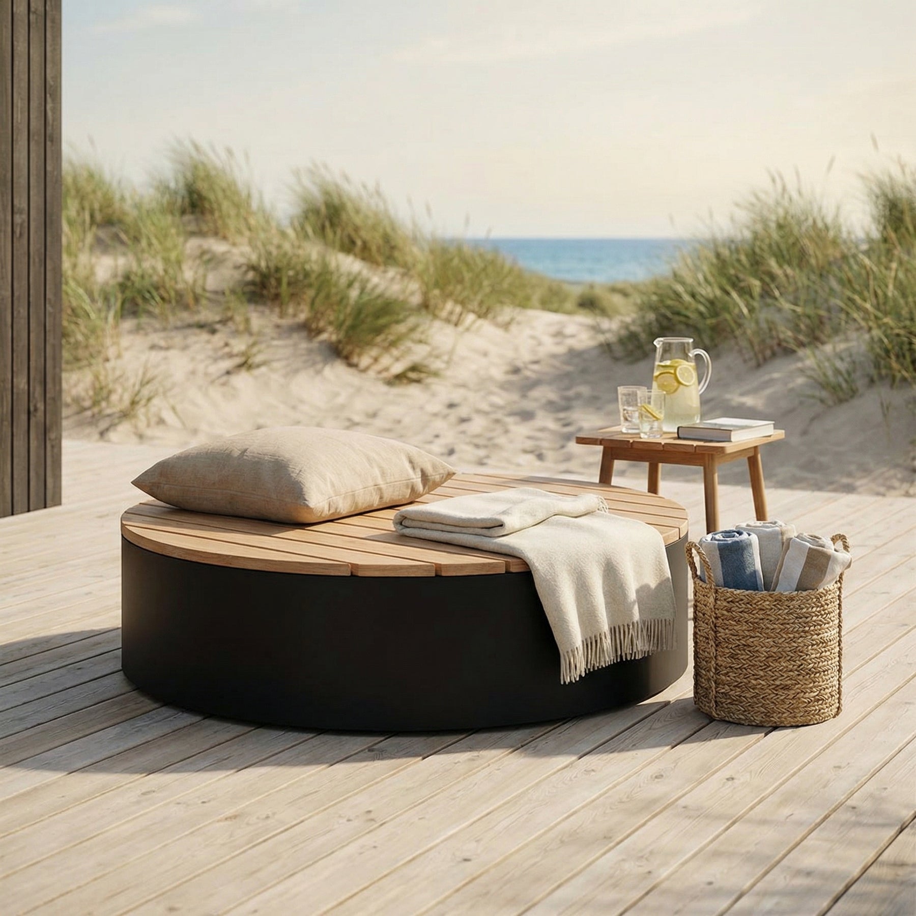 Das Holz ist unbehandelt und wird mit der Zeit durch Wind und Wetter wunderschön grau. Sie können es auch ölen, um die goldene Farbe zu bewahren.