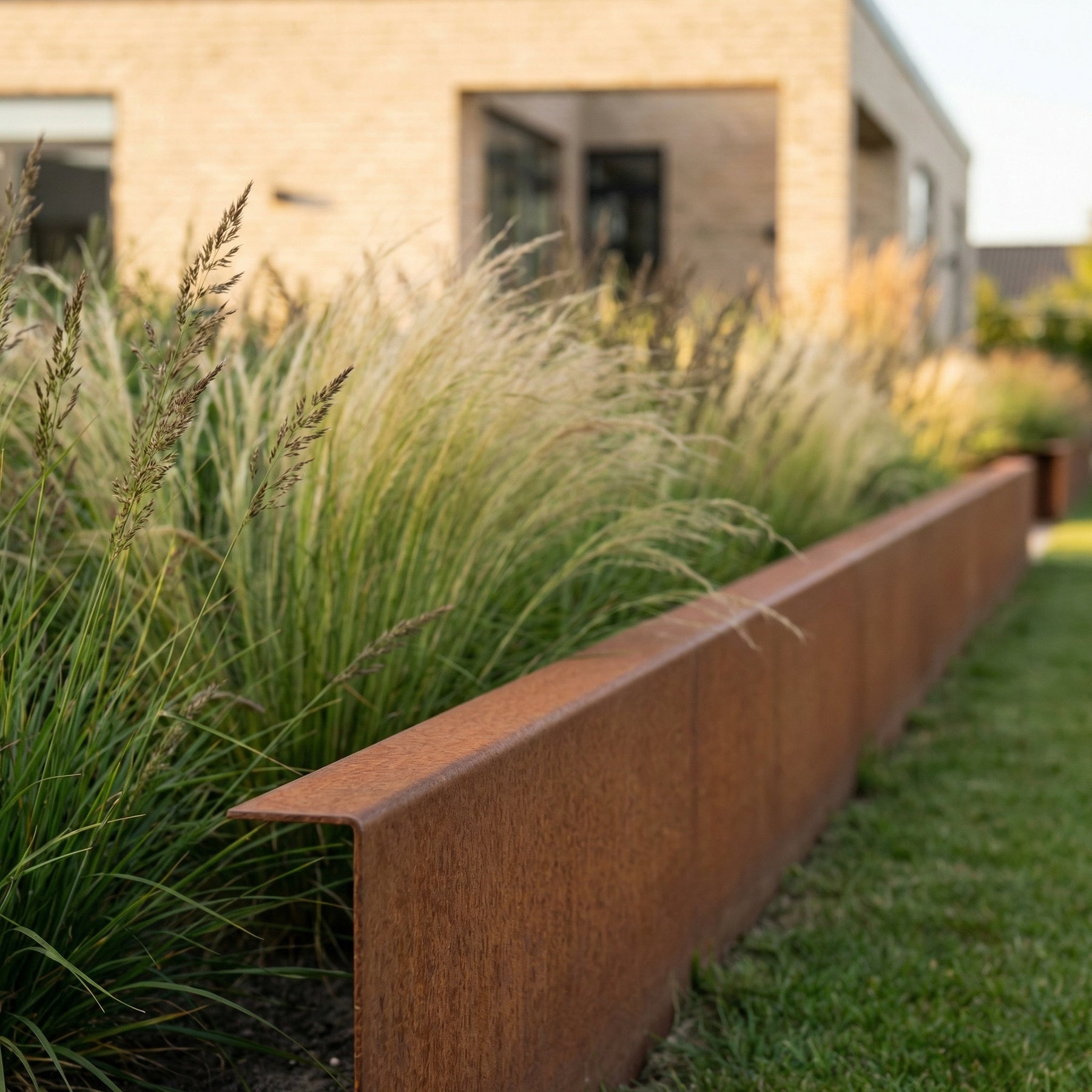Beeteinfassung aus 3 mm Cortenstahl mit gebogener Oberkante – Stabilität trifft Design