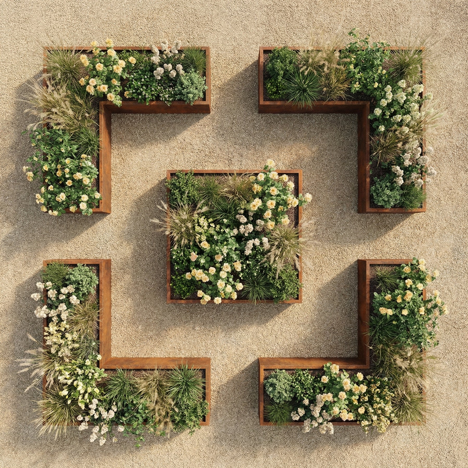 Die Eckbeete bilden den Rahmen Ihrer Gartengestaltung, während das quadratische Element das Design im Zentrum vollendet. Das Modell „Løgstør“ ist ideal für strukturierte Gemüsegärten, moderne Blumenbeete oder als elegante Raumtrennung.